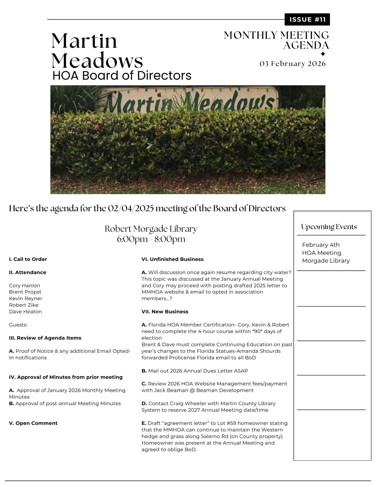 Get immediate access to communications from your HOA Board of Directors and fellow association members. From meeting minutes and official documents to a calendar of upcoming events, this is your hub for News and Updates for Martin Meadows residents.